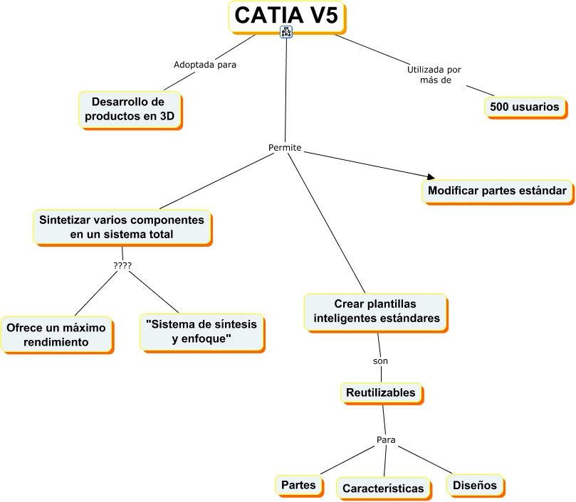 Este Cmap, tiene información relacionada con: F4, Reutilizables Para Diseños, CATIA V5 Adoptada para Desarrollo de productos en 3D, CATIA V5 Permite Crear plantillas inteligentes estándares, Sintetizar varios componentes en un sistema total ???? Ofrece un máximo rendimiento, CATIA V5 Utilizada por más de 500 usuarios, Crear plantillas inteligentes estándares son Reutilizables, Reutilizables Para Partes, CATIA V5 Permite Modificar partes estándar, CATIA V5 Permite Sintetizar varios componentes en un sistema total, Sintetizar varios componentes en un sistema total ???? "Sistema de síntesis y enfoque", Reutilizables Para Características