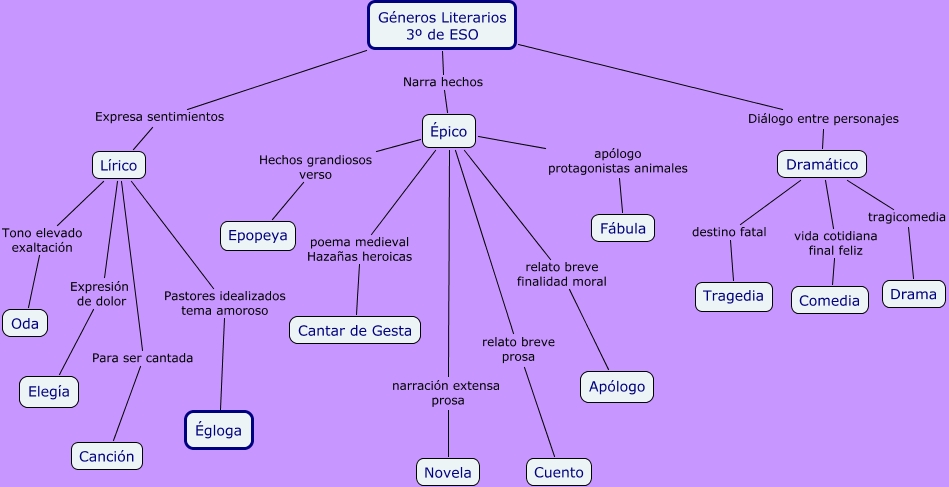 Este Cmap, tiene información relacionada con: Géneros Literarios-3º de ESO, Dramático tragicomedia Drama, Géneros Literarios 3º de ESO Expresa sentimientos Lírico, Épico apólogo protagonistas animales Fábula, Lírico Expresión de dolor Elegía, Épico narración extensa prosa Novela, Épico relato breve prosa Cuento, Dramático vida cotidiana final feliz Comedia, Lírico Tono elevado exaltación Oda, Lírico Para ser cantada Canción, Lírico Pastores idealizados tema amoroso Égloga, Géneros Literarios 3º de ESO Narra hechos Épico, Géneros Literarios 3º de ESO Diálogo entre personajes Dramático, Épico relato breve finalidad moral Apólogo, Épico Hechos grandiosos verso Epopeya, Épico poema medieval Hazañas heroicas Cantar de Gesta, Dramático destino fatal Tragedia