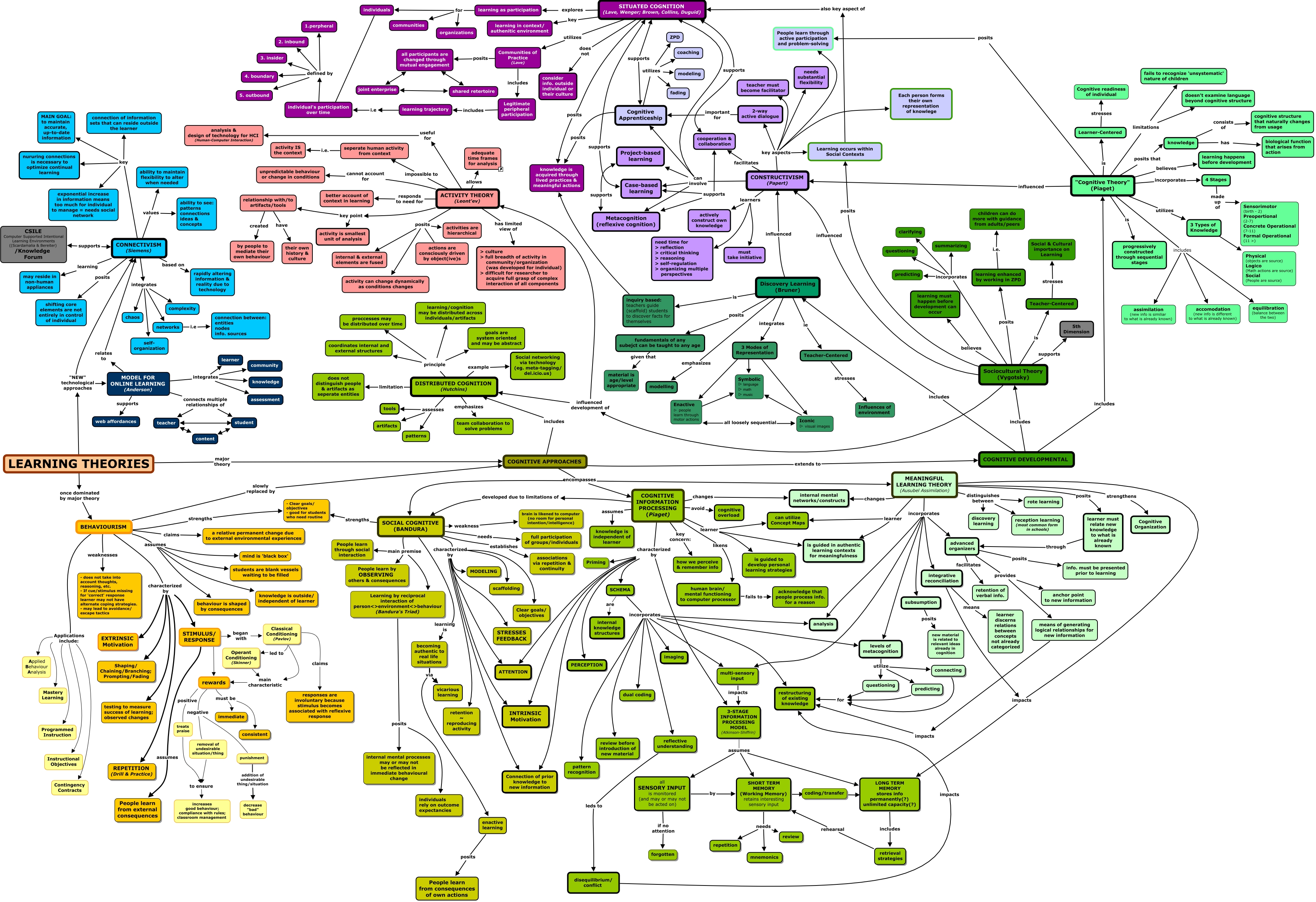 This Concept Map, created with IHMC CmapTools, has information related to: Earle cMap FINAL (ETEC 512 64A_NOV.23_08), MEANINGFUL LEARNING THEORY (Ausubel Assimilation) distinguishes between rote learning, COGNITIVE APPROACHES encompasses COGNITIVE INFORMATION PROCESSING (Piaget), integrative reconciliation means learner discerns relations between concepts not already categorized, STIMULUS/ RESPONSE ???? rewards, Classical Conditioning (Pavlov) main characteristic rewards, CONNECTIVISM (Siemens) key connection of information sets that can reside outside the learner, LEARNING THEORIES major theory COGNITIVE APPROACHES, all SENSORY INPUT is monitored (and may or may not be acted on) by SHORT TERM MEMORY (Working Memory) retains interesting sensory input, CONNECTIVISM (Siemens) key exponential increase in information means too much for individual to manage = needs social network, BEHAVIOURISM strengths - Clear goals/ objectives - good for students who need routine, "Cognitive Theory" (Piaget) includes equilibration (balance between the two), Learning by reciprocal interaction of person<>environment<>behaviour (Bandura's Triad) posits individuals rely on outcome expectancies, MEANINGFUL LEARNING THEORY (Ausubel Assimilation) incorporates multi-sensory input, SOCIAL COGNITIVE (BANDURA) characterized by Clear goals/ objectives, CONNECTIVISM (Siemens) learning may reside in non-human appliances, rewards negative removal of undesirable situation/thing, BEHAVIOURISM Applications include: Applied Behaviour Analysis, SOCIAL COGNITIVE (BANDURA) characterized by retention ~ reproducing activity, CONSTRUCTIVISM (Papert) key aspects teacher must become facilitator, seperate human activity from context i.e. activity IS the context