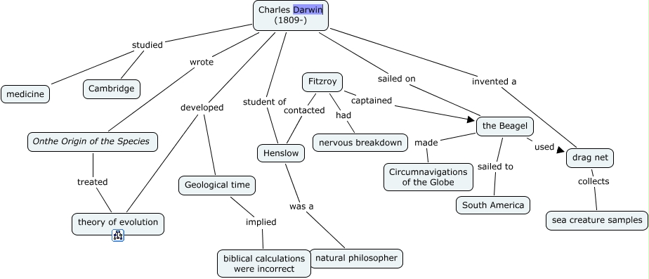 Darwin, Onthe Origin of the Species treated theory of evolution, Henslow was a natural philosopher, Charles Darwin (1809-) invented a drag net, the Beagel sailed to South America, Charles Darwin (1809-) developed Geological time, Charles Darwin (1809-) wrote Onthe Origin of the Species, Fitzroy contacted Henslow, Charles Darwin (1809-) student of Henslow, Charles Darwin (1809-) developed theory of evolution, the Beagel used drag net