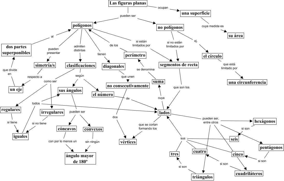 Este Cmap, tiene información relacionada con: Las figuras planas, polígonos si están limitados por segmentos de recta, irregulares si no tiene iguales, el número de lados, Las figuras planas ocupan una superficie, pentágonos si son cinco, triángulos si son tres, seis sus lados, lados pueden ser, entre otros triángulos, Las figuras planas pueden ser polígonos, clasificaciones según el número, no polígonos ej. el círculo, suma se denomina perímetro, clasificaciones según sus ángulos, iguales todos lados, lados pueden ser, entre otros cuadriláteros, clasificaciones como ser regulares, tres sus lados, polígonos admiten distintas clasificaciones, hexágonos si son seis, dos partes superponibles al polígonos