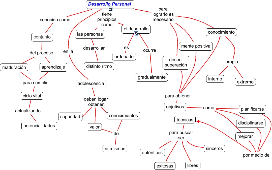Este mapa conceptual tiene información relacionada a: desarrollo personal, conocimiento propio interno, Desarrollo Personal para lograrlo es mecesario mente positiva, mejorar por medio de técnicas, maduración para cumplir ciclo vital, Desarrollo Personal tiene principios como las personas, conocimiento propio extrerno, conjunto del proceso maduración, deseo superación para obtener objetivos, técnicas para buscar ser auténticos, ciclo vital actualizando potencialidades, Desarrollo Personal conocido como conjunto, conocimientos de sí mismos, adolescencia deben logar obtener seguridad, adolescencia deben logar obtener conocimientos, conjunto del proceso aprendizaje, las personas desarrollan distinto ritmo, técnicas para buscar ser sinceros, el desarrollo ocurre gradualmente, Desarrollo Personal tiene principios como el desarrollo, Desarrollo Personal para lograrlo es mecesario conocimiento