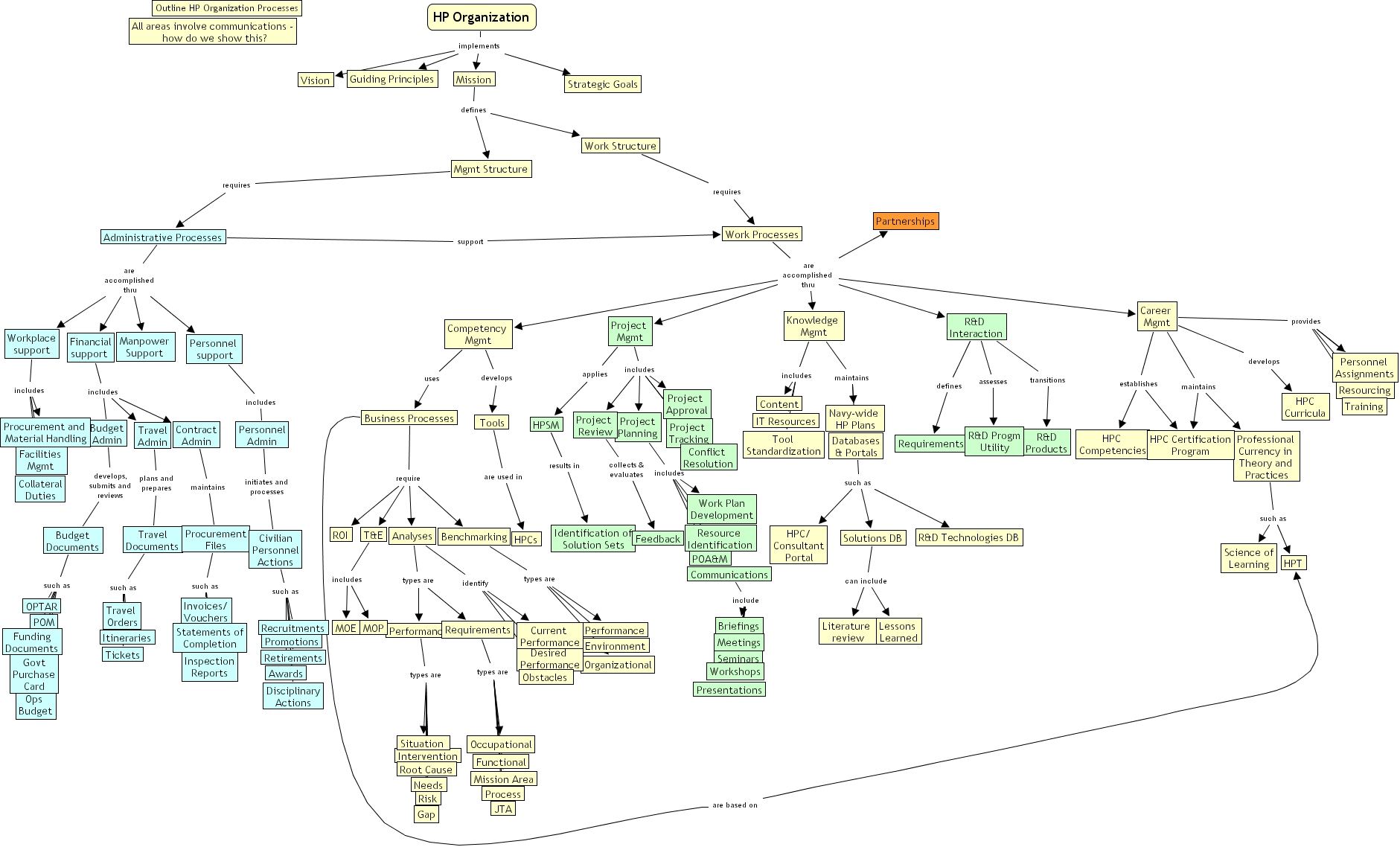 Databases & Portals such as R&D Technologies DB, Databases & Portals such as Solutions DB, Databases & Portals such as HPC/ Consultant Portal, Knowledge Mgmt maintains Databases & Portals, Knowledge Mgmt maintains Navy-wide HP Plans, Career Mgmt provides Resourcing, Career Mgmt provides Training, Career Mgmt provides Personnel Assignments, Project Review collects & evaluates Feedback, Career Mgmt maintains Professional Currency in Theory and Practices, Career Mgmt maintains HPC Certification Program, Work Processes are accomplished thru Partnerships, Work Processes are accomplished thru Knowledge Mgmt, Work Processes are accomplished thru R&D Interaction, Work Processes are accomplished thru Project Mgmt, Work Processes are accomplished thru Competency Mgmt, Work Processes are accomplished thru Career Mgmt, Budget Admin develops, submits and reviews Budget Documents, Procurement Files such as Invoices/ Vouchers, Procurement Files such as Statements of Completion, Procurement Files such as Inspection Reports, Professional Currency in Theory and Practices such as HPT, Professional Currency in Theory and Practices such as Science of Learning, Performance types are Root Cause, Performance types are Needs, Performance types are Risk, Performance types are Situation, Performance types are Gap, Performance types are Intervention, R&D Interaction assesses R&D Progm Utility, Work Structure requires Work Processes, Solutions DB can include Literature review, Solutions DB can include Lessons Learned, T&E includes MOP, T&E includes MOE, Business Processes require Benchmarking, Business Processes require ROI, Business Processes require Analyses, Business Processes require T&E, R&D Interaction transitions R&D Products, Workplace support includes Facilities Mgmt, Workplace support includes Collateral Duties, Workplace support includes Procurement and Material Handling, Contract Admin maintains Procurement Files, Business Processes are based on HPT, Project Mgmt applies HPSM, Competency Mgmt uses Business Processes, HPSM results in Identification of Solution Sets, Mgmt Structure requires Administrative Processes, R&D Interaction defines Requirements, Project Mgmt includes Project Review, Project Mgmt includes Project Approval, Project Mgmt includes Conflict Resolution, Project Mgmt includes Project Tracking, Project Mgmt includes Project Planning, Civilian Personnel Actions such as Awards, Civilian Personnel Actions such as Recruitments, Civilian Personnel Actions such as Retirements, Civilian Personnel Actions such as Disciplinary Actions, Civilian Personnel Actions such as Promotions, Career Mgmt develops HPC Curricula, Personnel Admin initiates and processes Civilian Personnel Actions, Personnel Assignments provides Resourcing, Personnel Assignments provides Training, Mission defines Work Structure, Mission defines Mgmt Structure, Budget Documents such as Govt Purchase Card, Budget Documents such as POM, Budget Documents such as OPTAR, Budget Documents such as Ops Budget, Budget Documents such as Funding Documents, Administrative Processes are accomplished thru Personnel support, Administrative Processes are accomplished thru Workplace support, Administrative Processes are accomplished thru Manpower Support, Administrative Processes are accomplished thru Financial support, Requirements types are JTA, Requirements types are Occupational, Requirements types are Functional, Requirements types are Mission Area, Requirements types are Process, Career Mgmt establishes HPC Certification Program, Career Mgmt establishes HPC Competencies, Tools are used in HPCs, Project Planning includes Communications, Project Planning includes POA&M, Project Planning includes Resource Identification, Project Planning includes Work Plan Development, Competency Mgmt develops Tools, HP Organization implements Strategic Goals, HP Organization implements Mission, HP Organization implements Vision, HP Organization implements Guiding Principles, Communications include Meetings, Communications include Briefings, Communications include Workshops, Communications include Seminars, Communications include Presentations, Personnel support includes Personnel Admin, Benchmarking types are Environment, Benchmarking types are Performance, Benchmarking types are Organizational, Knowledge Mgmt includes Content, Knowledge Mgmt includes IT Resources, Knowledge Mgmt includes Tool Standardization, Analyses identify Current Performance, Analyses identify Obstacles, Analyses identify Desired Performance, Travel Admin plans and prepares Travel Documents, Travel Documents such as Itineraries, Travel Documents such as Travel Orders, Travel Documents such as Tickets, Analyses types are Requirements, Analyses types are Performance, Administrative Processes support Work Processes, Financial support includes Contract Admin, Financial support includes Travel Admin, Financial support includes Budget Admin