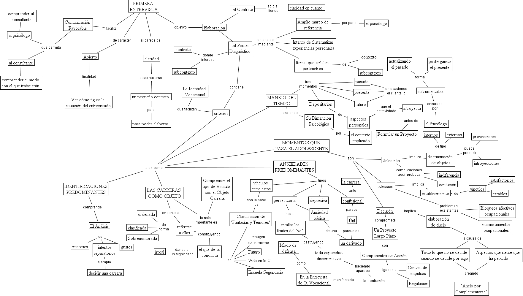 Entrevista Vocacional, intentos reparatorios ejemplo decidir una carrera, IDENTIFICACIONES PREDOMINANTES comprende El Análisis, confusional ante la carrera, Depositarios tres momentos presente, instrumentaliza en ocaciones el cliente lo pasado, claridad debe hacerse un pequeño contrato, MOMENTOS QUE PASA EL ADOLESCENTE son Elección, PRIMERA ENTREVISTA facilita Comunicación Favorable, LAS CARRERAS COMO OBJETO evidente al referirse a ellas, MANEJO DEL TIEMPO tres momentos futuro