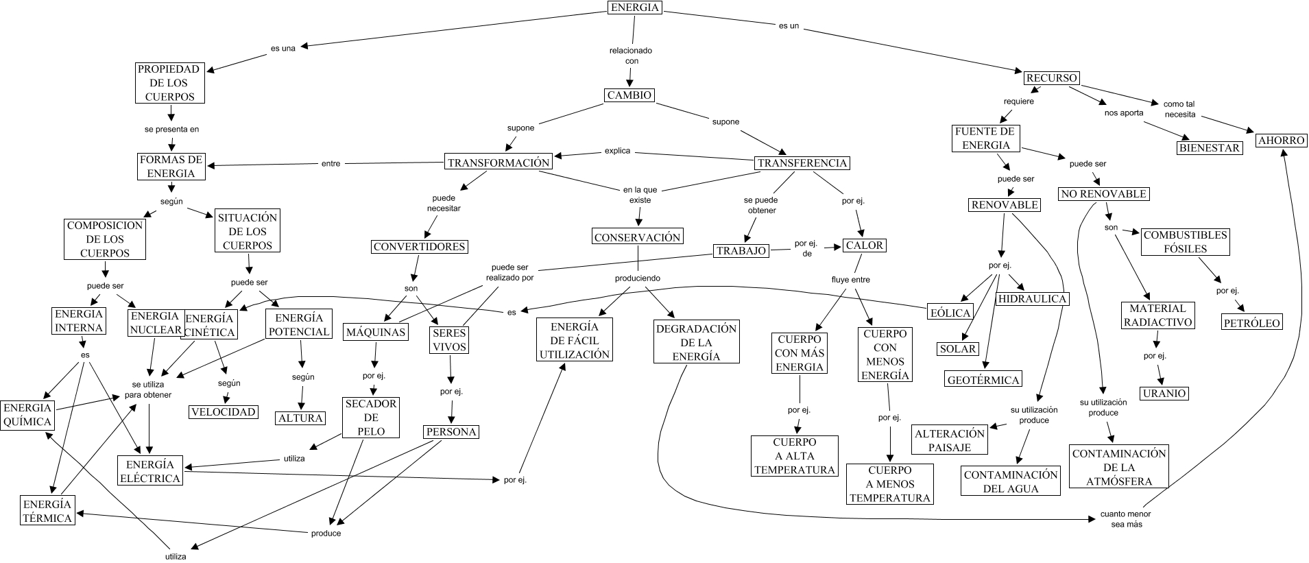 ENERGIA2, NO RENOVABLE son COMBUSTIBLES FÓSILES, ENERGÍA TÉRMICA se utiliza para obtener ENERGÍA ELÉCTRICA, RENOVABLE su utilización produce ALTERACIÓN PAISAJE, ENERGÍA POTENCIAL se utiliza para obtener ENERGÍA ELÉCTRICA, PROPIEDAD DE LOS CUERPOS se presenta en FORMAS DE ENERGIA, MÁQUINAS por ej. SECADOR DE PELO, CONVERTIDORES son SERES VIVOS, SITUACIÓN DE LOS CUERPOS puede ser ENERGÍA POTENCIAL, ENERGÍA CINÉTICA según VELOCIDAD, TRABAJO puede ser realizado por SERES VIVOS