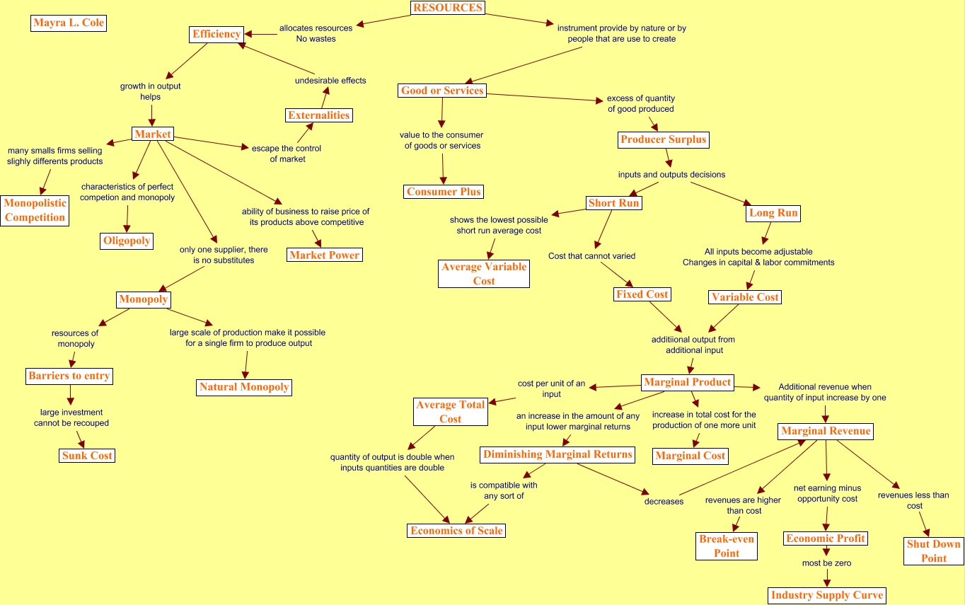 This Concept Map, created with IHMC CmapTools, has information related to: Block 2, Variable Cost additiional output from additional input Marginal Product, Marginal Revenue net earning minus opportunity cost Economic Profit, Short Run shows the lowest possible short run average cost Average Variable Cost, Marginal Product increase in total cost for the production of one more unit Marginal Cost, Market many smalls firms selling slighly differents products Monopolistic Competition, Barriers to entry large investment cannot be recouped Sunk Cost, Marginal Product an increase in the amount of any input lower marginal returns Diminishing Marginal Returns, Producer Surplus inputs and outputs decisions Long Run, RESOURCES allocates resources No wastes Efficiency, Short Run Cost that cannot varied Fixed Cost, Marginal Revenue revenues are higher than cost Break-even Point, Good or Services value to the consumer of goods or services Consumer Plus, Market only one supplier, there is no substitutes Monopoly, Monopoly large scale of production make it possible for a single firm to produce output Natural Monopoly, Market ability of business to raise price of its products above competitive Market Power, Fixed Cost additiional output from additional input Marginal Product, Efficiency growth in output helps Market, Producer Surplus inputs and outputs decisions Short Run, Market escape the control of market Externalities, Marginal Product cost per unit of an input Average Total Cost