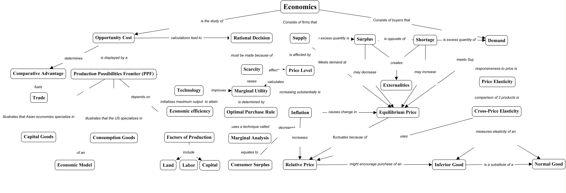 This Concept Map, created with IHMC CmapTools, has information related to: Microeconomics (Part 1) vrs 2.9.1 map, Factors of Production include Capital, Economics is the study of Opportunity Cost, Scarcity raises Marginal Utility, Price Level calculates Marginal Utility, Technology improves Marginal Utility, Equilibrium Price fluctuates because of Relative Price, Opportunity Cost calculations lead to Rational Decision, Shortage creates Externalities, Economics Consists of firms that Supply, Inflation increases Relative Price, Factors of Production include Land, Cross-Price Elasticity measures elasticity of an Inferior Good, Supply Meets demand at Equilibrium Price, Production Possibilities Frontier (PPF) illustrates that the US specializes in Consumption Goods, Factors of Production include Labor, Factors of Production include Capital, Inflation causes change in Equilibrium Price, Opportunity Cost is displayed by a Production Possibilities Frontier (PPF), Surplus may decrease Equilibrium Price, Supply is affected by Price Level