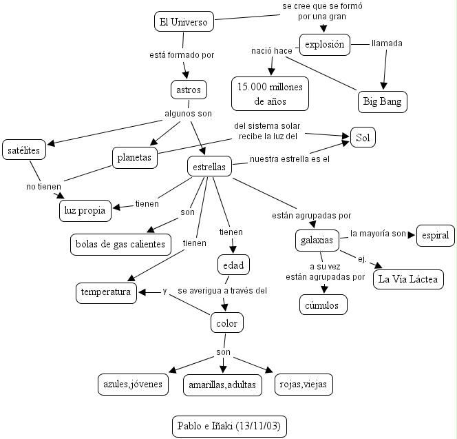 estrellas est�n agrupadas por galaxias, estrellas tienen luz propia, estrellas tienen edad, planetas del sistema solar recibe la luz del Sol, El Universo est� formado por astros, astros algunos son sat�lites, astros algunos son planetas, astros algunos son estrellas, estrellas nuestra estrella es el Sol, galaxias la mayor�a son espiral, estrellas tienen temperatura, Big Bang naci� hace 15.000 millones de a�os, El Universo se cree que se form� por una gran explosi�n, color y temperatura, edad se averigua a trav�s del color, sat�lites no tienen luz propia, planetas no tienen luz propia, estrellas son bolas de gas calientes, explosi�n llamada Big Bang, explosi�n naci� hace 15.000 millones de a�os, galaxias a su vez est�n agrupadas por c�mulos , color son rojas,viejas, color son amarillas,adultas, color son azules,j�venes, galaxias ej. La V�a L�ctea
