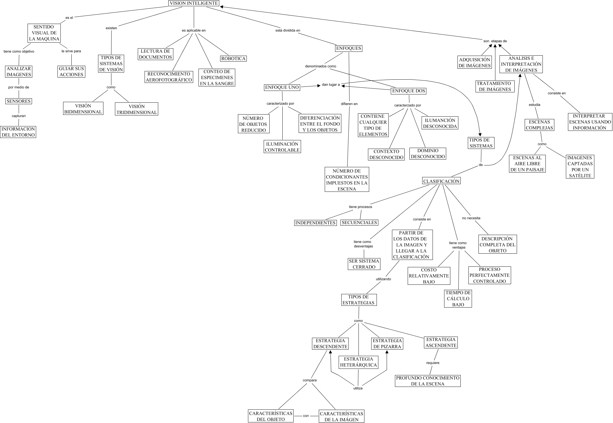 Este mapa conceptual tiene información relacionada a: VISION INTELIGENTE, PROFUNDO CONOCIMIENTO DE LA ESCENA requiere ESTRATEGIA ASCENDENTE, ENFOQUE UNO caracterizado por ILUMINACIÓN CONTROLABLE, TIPOS DE SISTEMAS de CLASIFICACIÓN, VISION INTELIGENTE son etapas de ANALISIS E INTERPRETACIÓN DE IMÁGENES, VISION INTELIGENTE es aplicable en ROBOTICA, ANALISIS E INTERPRETACIÓN DE IMÁGENES estudia ESCENAS COMPLEJAS, TIPOS DE ESTRATEGIAS como ESTRATEGIA HETERÁRQUICA, ENFOQUES denominados como ENFOQUE UNO, ESTRATEGIA DE PIZARRA como ESTRATEGIA HETERÁRQUICA, VISION INTELIGENTE es el SENTIDO VISUAL DE LA MAQUINA