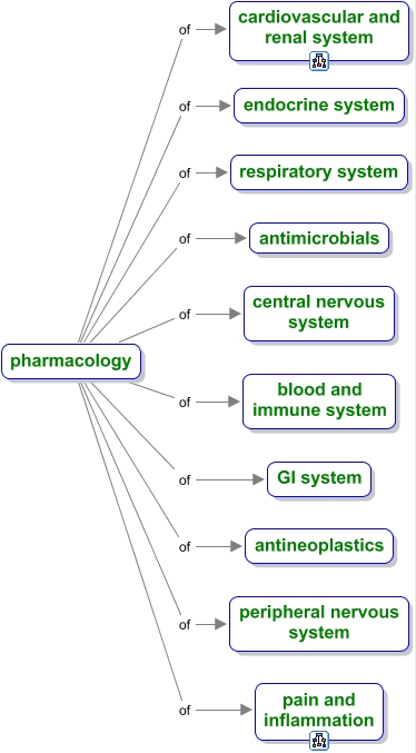 Systems, pharmacology of respiratory system, pharmacology of peripheral nervous system, pharmacology of antimicrobials, pharmacology of pain and inflammation, pharmacology of cardiovascular and renal system, pharmacology of GI system, pharmacology of antineoplastics, pharmacology of blood and immune system, pharmacology of central nervous system, pharmacology of endocrine system