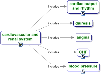 This Concept Map, created with IHMC CmapTools, has information related to: Cardiovascular, cardiovascular and renal system includes angina, cardiovascular and renal system includes blood pressure, cardiovascular and renal system includes diuresis, cardiovascular and renal system includes cardiac output and rhythm, cardiovascular and renal system includes CHF