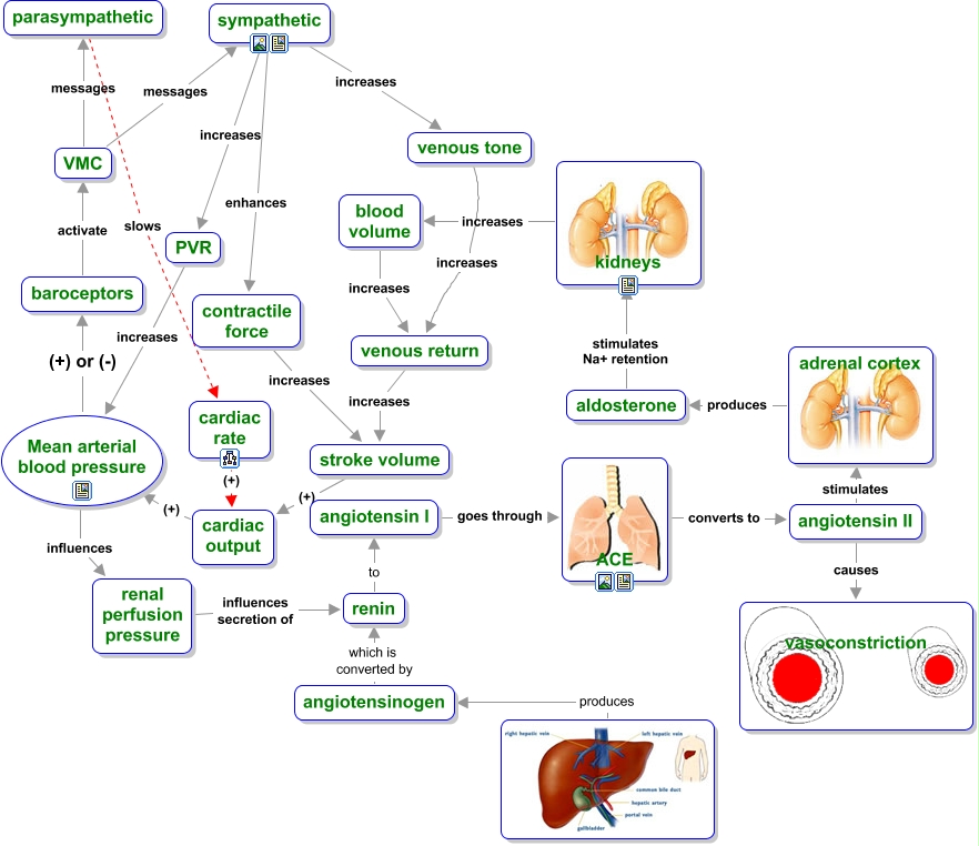 This Concept Map, created with IHMC CmapTools, has information related to: bloodpressure, venous return increases stroke volume, adrenal cortex produces aldosterone, sympathetic increases PVR, sympathetic enhances contractile force, VMC messages parasympathetic, blood volume increases venous return, venous tone increases venous return, stroke volume (+) cardiac output, renal perfusion pressure influences secretion of renin, sympathetic increases venous tone, angiotensin I goes through ACE, ACE converts to angiotensin II, produces angiotensinogen, cardiac rate (+) cardiac output, kidneys increases blood volume, Mean arterial blood pressure influences renal perfusion pressure, PVR increases Mean arterial blood pressure, angiotensinogen which is converted by renin, baroceptors activate VMC, angiotensin II causes vasoconstriction