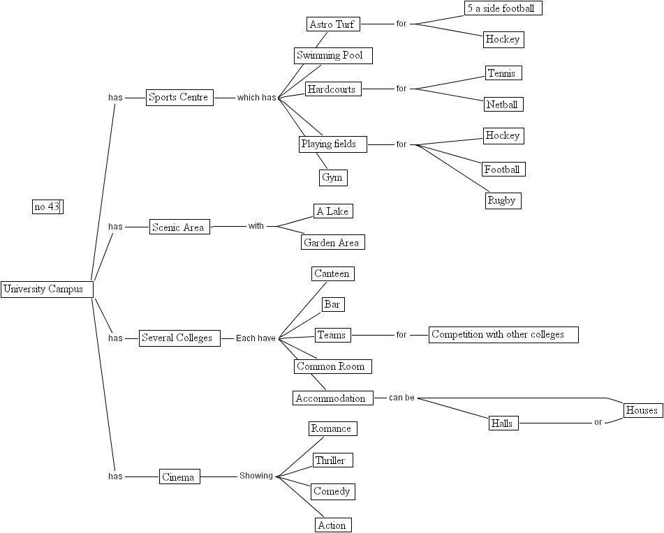 no 43, football, canteen, thriller, no 43, several colleges, halls, tennis, sports centre, common room, hockey, hardcourts, university campus, action, playing fields, scenic area, a lake, houses, cinema, competition with other colleges, teams, accommodation, rugby, romance, 5 a side football, gym, bar, garden area, swimming pool, comedy, astro turf, hockey, netball