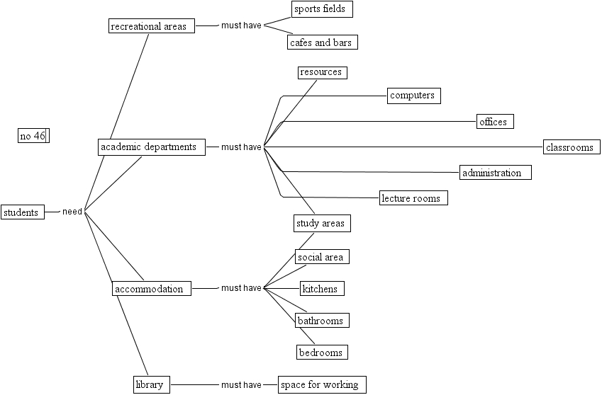 no 46, classrooms, accommodation, kitchens, students, bathrooms, no 46, administration, social area, sports fields, lecture rooms, library, space for working, bedrooms, offices, resources, computers, recreational areas, study areas, cafes and bars, academic departments