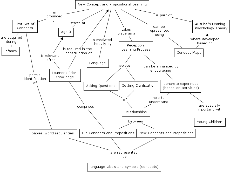 new concepts and propositional learning, old concepts and propositions, asking questions, ausubel's leaning psychology theory, new concept and propositional learning, concept maps, infancy, first set of concepts, reception learning process, language, relationships, getting clarification, concrete experinces (hands-on activities), young children, new concepts and propositions, learner's prior knowledge, babies' world regularities, language labels and symbols (concepts), age 3