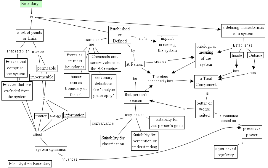 system boundary, chemicals and concentrations in the bz reaction, system dynamics, a person, predictive power, suitability for that person's goals, implicit in naming the system, file system boundary, established or defined, convenience, outside, better or worse suited, human skin as boundary of the self, dictionary definitions like analytic philosophy , information, inside, matter, ontological meaning of the system, fronts as air mass boundaries, permeable, entities that comprise the system, entitites that are excluded from the system, a tacit component, energy, suitability for classification, impermeable, boundary , suitability for perception or understanding, that person's reason, a set of points or limits, a percieved regularity, a defining characteristic of a system