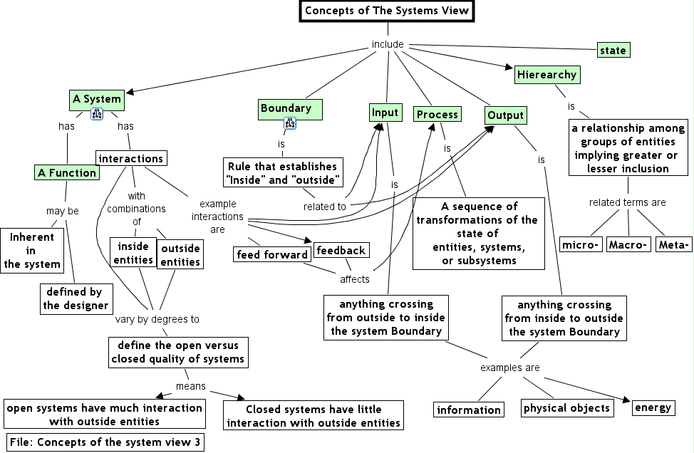 Concepts of the System View - 3, outside entities vary by degrees to define the open versus closed quality of systems, define the open versus closed quality of systems means Closed systems have little interaction with outside entities, anything crossing from inside to outside the system Boundary examples are information, Concepts of The Systems View include A System, Concepts of The Systems View include Input, anything crossing from outside to inside the system Boundary examples are energy, anything crossing from inside to outside the system Boundary examples are energy, Rule that establishes "Inside" and "outside" related to Input, Process is A sequence of transformations of the state of entities, systems, or subsystems, Concepts of The Systems View include state
