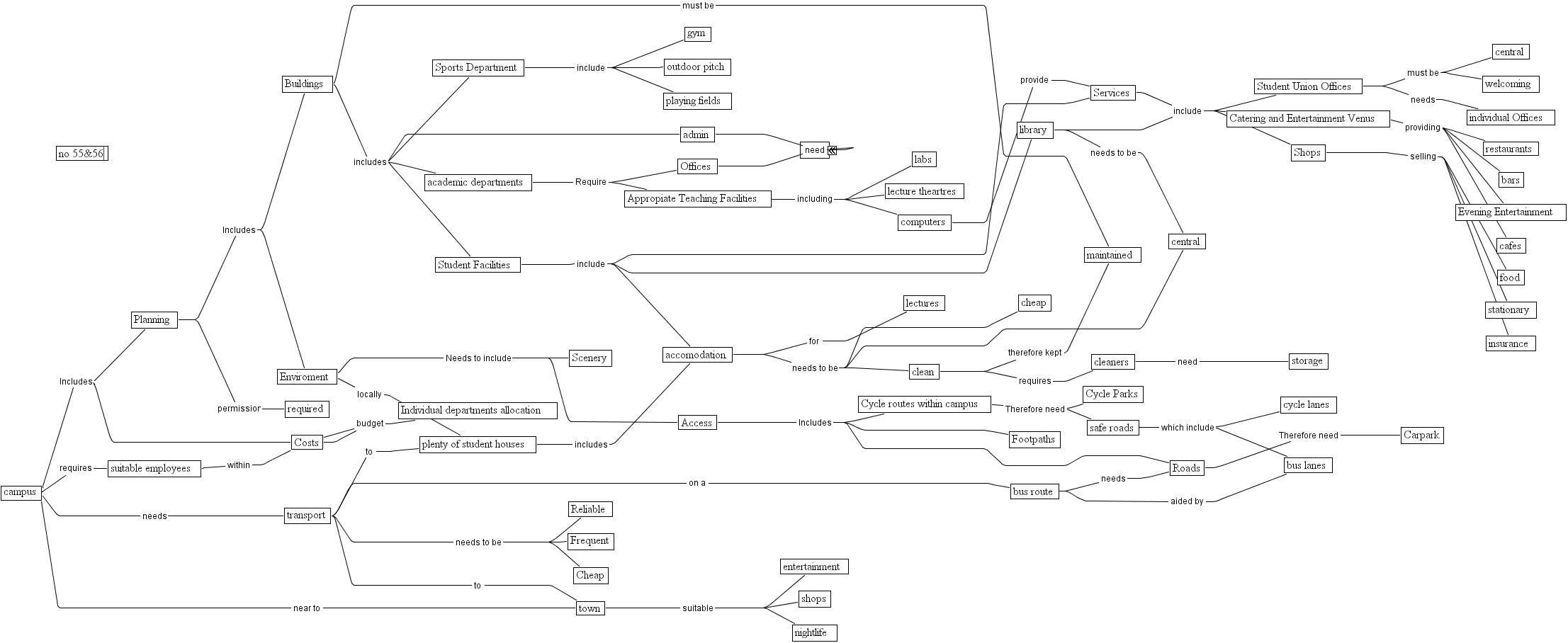 no 55&56, food, library, scenery, bus lanes, cafes, outdoor pitch, buildings, labs, clean, safe roads, footpaths, catering and entertainment venus, access, evening entertainment, accomodation, cleaners, cheap, transport, cycle parks, shops, carpark, insurance, admin, deparmental offices, restaurants, no 55&56, services, nightlife, enviroment, cycle routes within campus, suitable employees, storage, cycle lanes, academic departments, central, stationary, lectures, costs, gym, playing fields, required, appropiate teaching facilities, student union offices, town, central, reliable, bus route, planning, individual offices, campus, shops, sports department, student facilities, bars, welcoming, roads, maintained, computers, lecture theartres, individual departments allocation, offices, frequent, entertainment, plenty of student houses, cheap
