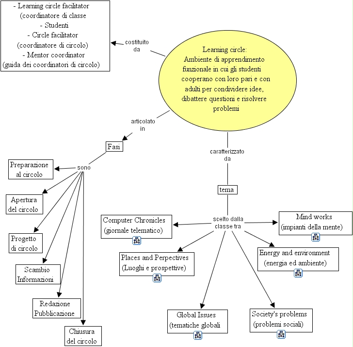 i learning circles, global issues (tematiche globali, preparazione al circolo, - learning circle facilitator (coordinatore di classe - studenti - circle facilitator (coordinatore di circolo) - mentor coordinator (guida dei coordinatori di circolo), learning circle ambiente di apprendimento funzionale in cui gli studenti cooperano con loro pari e con adulti per condividere idee, dibattere questioni e risolvere problemi, chiusura del circolo, society's problems (problemi sociali), energy and environment (energia ed ambiente), fasi, tema, apertura del circolo, places and perpectives (luoghi e prospettive), redazione pubblicazione, mind works (impianti della mente), computer chronicles (giornale telematico), scambio informazioni, progetto di circolo