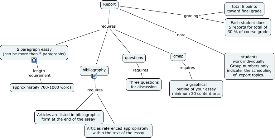 This Concept Map, created with IHMC CmapTools, has information related to: report requirements, Report grading Each student does 5 reports for total of 30 % of course grade, Report grading total 6 points toward final grade, Report requires 5 paragraph essay (can be more than 5 paragraphs), Report note students work individually. Group numbers only indicate the scheduling of report topics., bibliography requires Articles referenced appropriately within the text of the essay, cmap requires a graphical outline of your essay minimum 30 content arcs, questions requires Three questions for discussion, bibliography requires Articles are listed in bibliographic form at the end of the essay, Report requires cmap, Report requires bibliography, 5 paragraph essay (can be more than 5 paragraphs) length requirement approximately 700-1000 words, Report requires questions