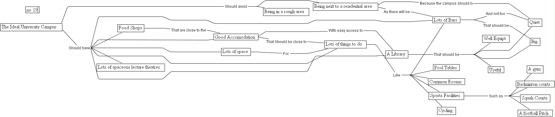 no 19, no 19, good accomodation, big, badminton courts, useful, cycling, a football pitch, lots of things to do, food shops, lots of bars, being next to a residential area, common rooms, a gym, quiet, the ideal university campus, a library, squah courts, being in a rough area, sports facilities, lots of spaceous lecture theatres, lots of space, well equipt, pool tables