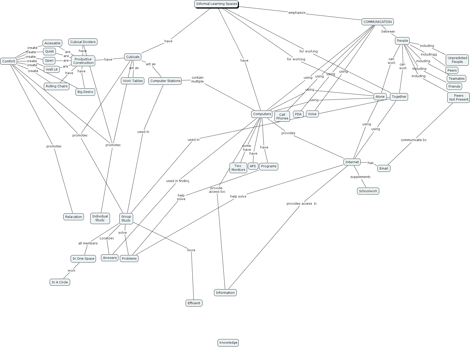 1, knowledge, information, voice, email, anwsers, two monitors, big desks, productive construction, relaxation, peers not present, afs, individual study, together, computer stations, programs, internet, people, cubicals, work tables, peers, communication, informal learning spaces, cell phones, comfort, well lit, quiet, friends, computers, open, in a circle, schoolwork, problems, unpredicted people, efficient, alone, in one space, group study, cubical dividers, pda, teamates, rolling chairs, accesable