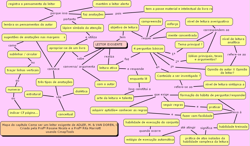 como ser um leitor inteligente - 2, forma��o do h�bito de perguntar responder, tr�s tipos de anota��es, enquanto l� , id�ias principais, teses e argumentos?, dial�tica, mapa do cap�tulo como ser um leitor exigente de adler, m. & van doren, c. criado pela prof� rosane nicola e a prof� rita marriott usando cmaptools, habilidade de execu��o do conjunto, lembra os pensamentos do autor , leitor exigente , tema principal ?, seguir regras, compreens�o, registra o pensamento do leitor , indicar cf p�gina..., arte da leitura = talento, estrutural, tra�ar linhas verticais, adquirir aptid�o= conhecer as regras, leitura ativa, fazer com facilidade, conceitual, 4 perguntas b�sicas, apropriar-se de um livro , habilidade treinada, com o autor, n�vel de leitura averiguativa , mente concentrada, est�gio de execu��o autom�tica, faz anota��es, praticar, tem a posse material e intelectual do livro ro, n�vel de leitura sint�pica a, l�pis= s�mbolo da aten��o , conte�do a ser investigado ?, esfor�o, objetivo de leitura, numerar, n�vel de leitura anal�tica, sugest�es de anota��es nas margens s , sublinhar circular , mant�m o leitor alerta , opini�o do autor x opini�o do leitor?, pr�tica de atos isolados da habilidade complexa da leitura