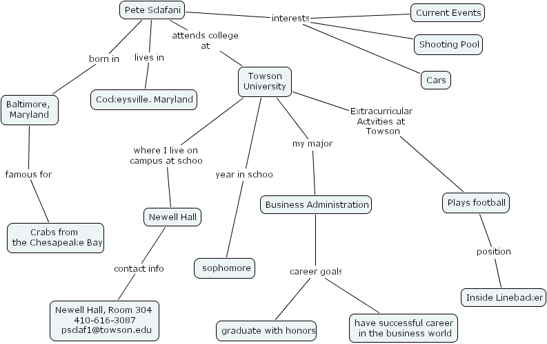 pete sclafani, graduate with honors, cars, have successful career in the business world, pete sclafani, crabs from the chesapeake bay, inside linebacker, cockeysville. maryland, plays football, newell hall, room 304 410-616-3087 psclaf1@towson.edu, current events, sophomore, shooting pool, towson university, baltimore, maryland, newell hall, business administration