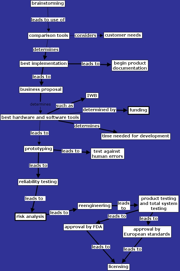 cmap 3, test against human errors, brainstorming, approval by european standards, product testing and total system testing, reliability testing, prototyping, risk analysis, best hardware and software tools, comparison tools, business proposal, licensing, reengineering, customer needs, iwb, approval by fda, time needed for development, begin product documentation, funding, best implementation