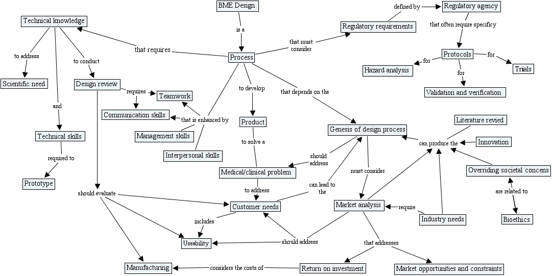 andriacchi concept map, overriding societal concens, product, protocols, genesis of design process, regulatory requirements, market analysis, market opportunities and constraints, manufacturing, communication skills, management skills, teamwork, bioethics, prototype, bme design, interpersonal skills, scientific need, useability, process, trials, design review, return on investment, innovation, medical clinical problem, customer needs, validation and verification, technical knowledge, hazard analysis, regulatory agency, industry needs, technical skills, literature revied