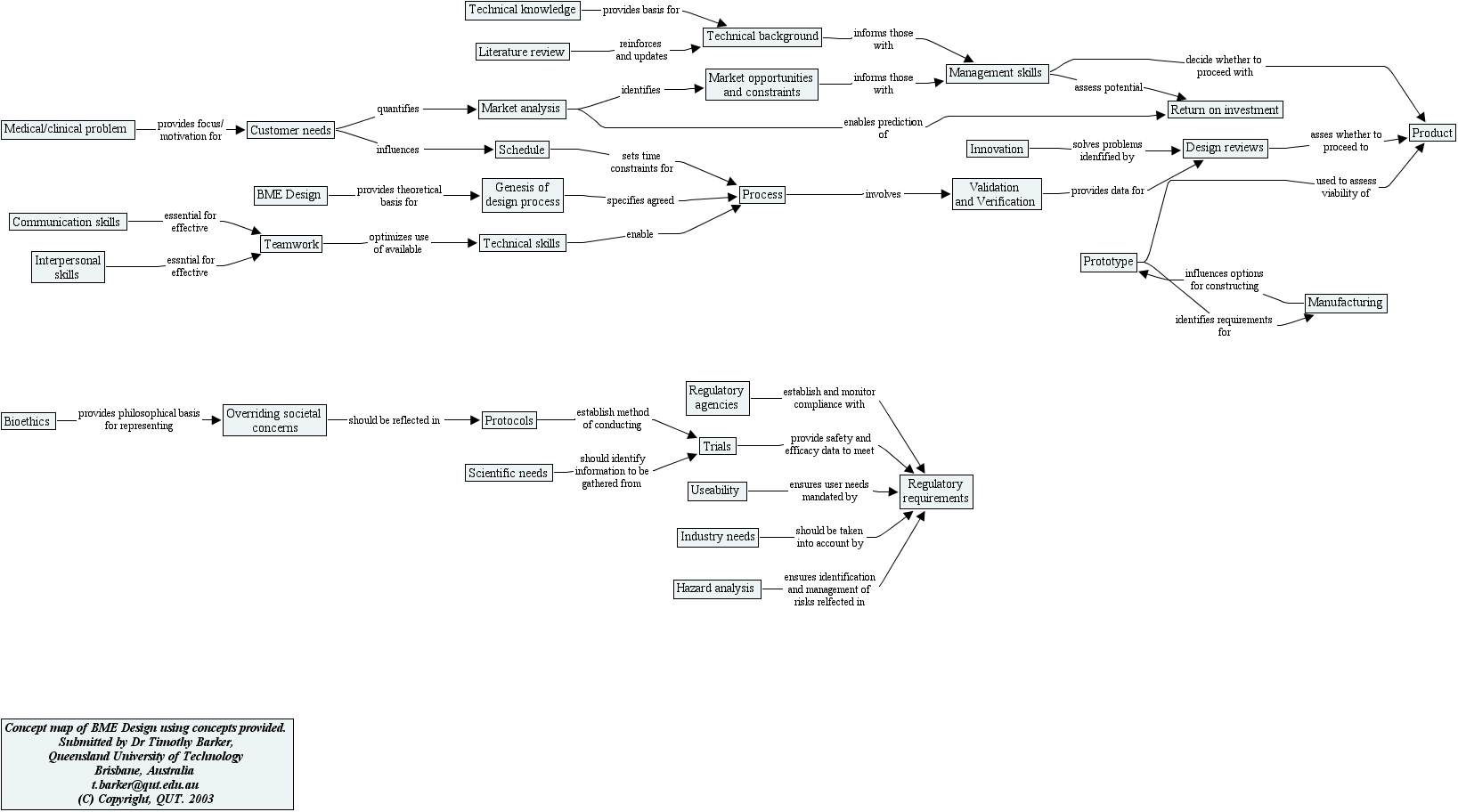 barker concept map (hierarchical format), market analysis, technical skills, teamwork, genesis of design process, customer needs, innovation, market opportunities and constraints, design reviews, useability, literature review, protocols, process, manufacturing, prototype, return on investment, concept map of bme design using concepts provided. submitted by dr timothy barker, queensland university of technology brisbane, australia t.barker@qut.edu.au (c) copyright, qut. 2003, overriding societal concerns, medical clinical problem, trials, industry needs, bioethics, regulatory requirements, interpersonal skills, product, technical knowledge, bme design, schedule, validation and verification, technical background, management skills, communication skills, scientific needs, hazard analysis, regulatory agencies
