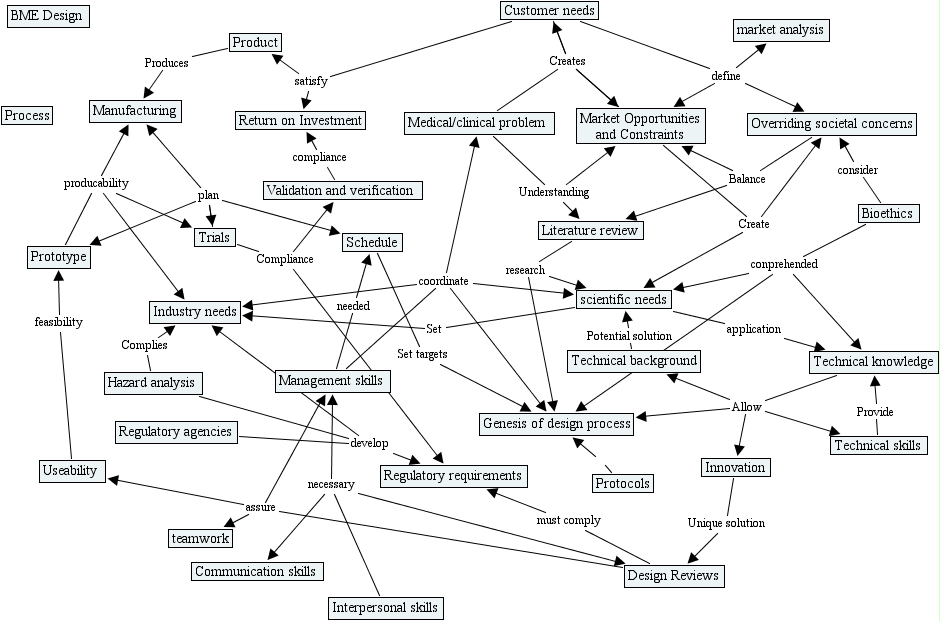 brock concept map, schedule, useability, overriding societal concerns, interpersonal skills, bioethics, regulatory agencies, scientific needs, market opportunities and constraints, technical background, prototype, literature review, market analysis, technical knowledge, genesis of design process, product, medical clinical problem, bme design, customer needs, return on investment, innovation, communication skills, technical skills, management skills, design reviews, process, validation and verification, trials, regulatory requirements, industry needs, manufacturing, teamwork, hazard analysis, protocols