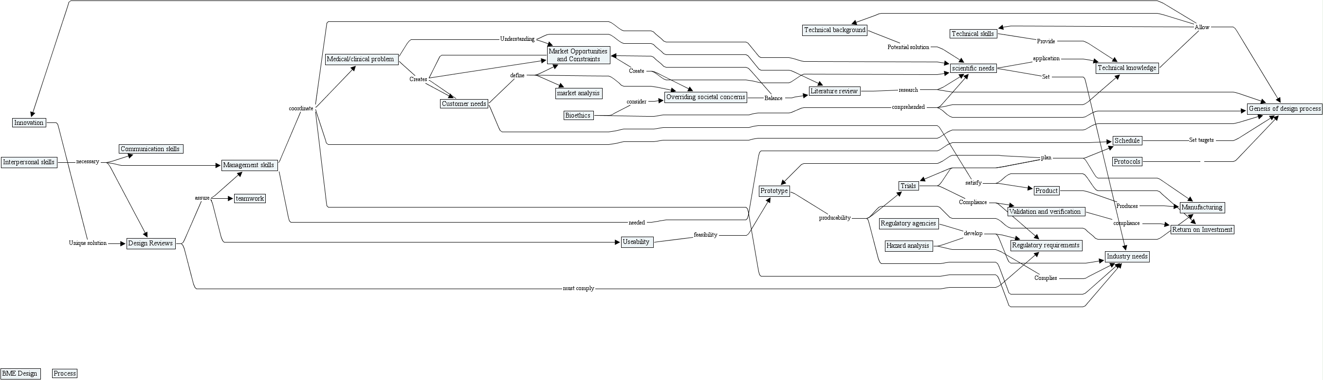 brock concept map (hierarchical format), useability, schedule, bioethics, interpersonal skills, overriding societal concerns, scientific needs, regulatory agencies, technical background, market opportunities and constraints, literature review, prototype, market analysis, genesis of design process, technical knowledge, product, customer needs, bme design, medical clinical problem, return on investment, innovation, technical skills, communication skills, management skills, design reviews, validation and verification, process, trials, teamwork, manufacturing, industry needs, regulatory requirements, hazard analysis, protocols