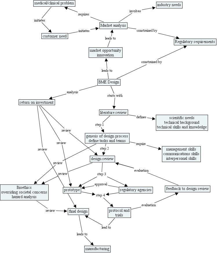 buchs concept map, regulatory agencies, industry needs, protocol and trials, medical clinical problem, bioethics overriding societal concerns hazard analysis, final design, return on investment, market opportunity innovation, regulatory requirements, market analysis, feedback to design review, manufacturing, scientific needs technical background technical skills and knowledge, bme design, design review, management skills communications skills interpersonal skills, genesis of design process define tasks and teams, prototype, literature review, customer need