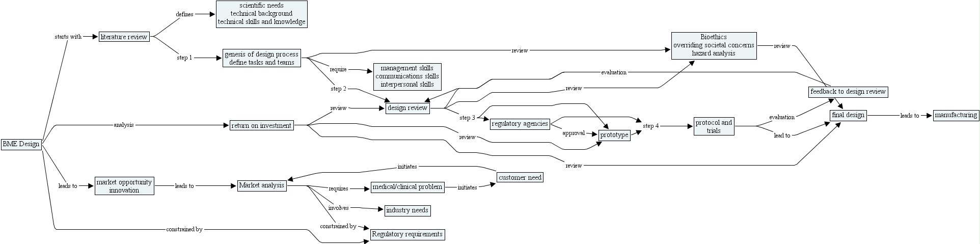 buchs concept map (hierarchical format), regulatory agencies, industry needs, protocol and trials, medical clinical problem, bioethics overriding societal concerns hazard analysis, final design, return on investment, market opportunity innovation, regulatory requirements, market analysis, feedback to design review, manufacturing, scientific needs technical background technical skills and knowledge, bme design, design review, management skills communications skills interpersonal skills, genesis of design process define tasks and teams, prototype, literature review, customer need