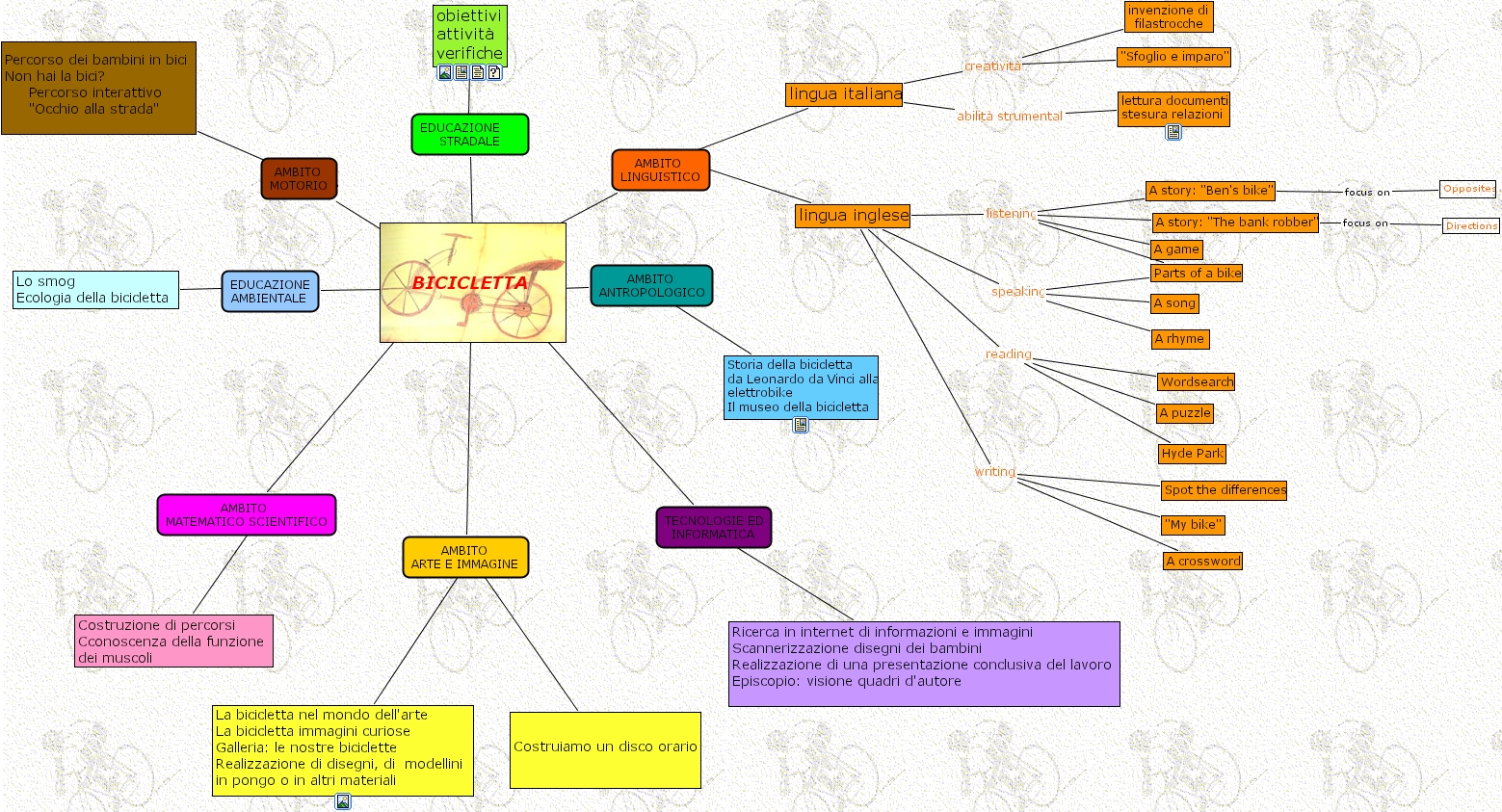 mappa bici monica, hyde park, a puzzle, ambito antropologico, invenzione di filastrocche, obiettivi attivit� verifiche, my bike , directions, ambito arte e immagine, parts of a bike, a game, percorso dei bambini in bici non hai la bici? percorso interattivo occhio alla strada , storia della bicicletta da leonardo da vinci alla elettrobike il museo della bicicletta , lingua italiana, educazione stradale, ricerca in internet di informazioni e immagini scannerizzazione disegni dei bambini realizzazione di una presentazione conclusiva del lavoro episcopio visione quadri d'autore , bicicletta, costruzione di percorsi cconoscenza della funzione dei muscoli, a song, la bicicletta nel mondo dell'arte la bicicletta immagini curiose galleria le nostre biciclette realizzazione di disegni, di modellini in pongo o in altri materiali, ambito matematico scientifico, a crossword, a story ben's bike , ambito linguistico, a story the bank robber , a rhyme, opposites, wordsearch, costruiamo un disco orario , sfoglio e imparo , tecnologie ed informatica, lo smog ecologia della bicicletta, spot the differences, educazione ambientale, lingua inglese, lettura documenti stesura relazioni, ambito motorio