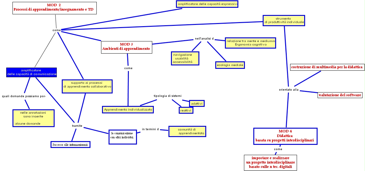 mod2 processi apprend insegnam td, amplificatore delle capacit� espressive, mod 2 processi di apprendimento insegnamento e td , costruzione di multimedia per la didattica, la comunicazione con altri individui. , relazione tra mente e mediumm ergonomia cognitiva, comunit� di apprendimentoto, amplificatore delle capacit� di comunicazione, mod 3 ambienti di apprendimento, strumento di produttivit� individuale, mod 4 didattica basata su progetti interdisciplinari , adattivi, navigazione usabilit� accessibilit� , nelle annotazioni sono inserite alcune domande , supporto ai processi di apprendimento collaborativo , l'accesso alle informazionnii, apprendimento individualizzato, reattivi, impostare e realizzare un progetto interdisciplinare basato sulle n tec. digitali, ecologia mediale, valutazione del software