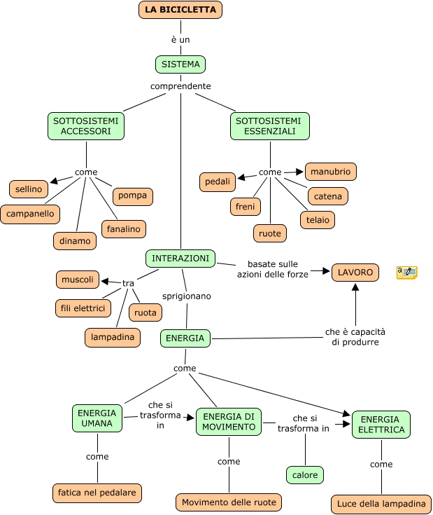 bicicletta, ENERGIA UMANA che si trasforma in ENERGIA DI MOVIMENTO, SOTTOSISTEMI ACCESSORI come campanello, SOTTOSISTEMI ACCESSORI come fanalino, ENERGIA come ENERGIA DI MOVIMENTO, ENERGIA DI MOVIMENTO come Movimento delle ruote, ENERGIA ELETTRICA come Luce della lampadina, ENERGIA come ENERGIA ELETTRICA, ENERGIA che è capacità di produrre LAVORO, SOTTOSISTEMI ESSENZIALI come freni, SOTTOSISTEMI ESSENZIALI come telaio