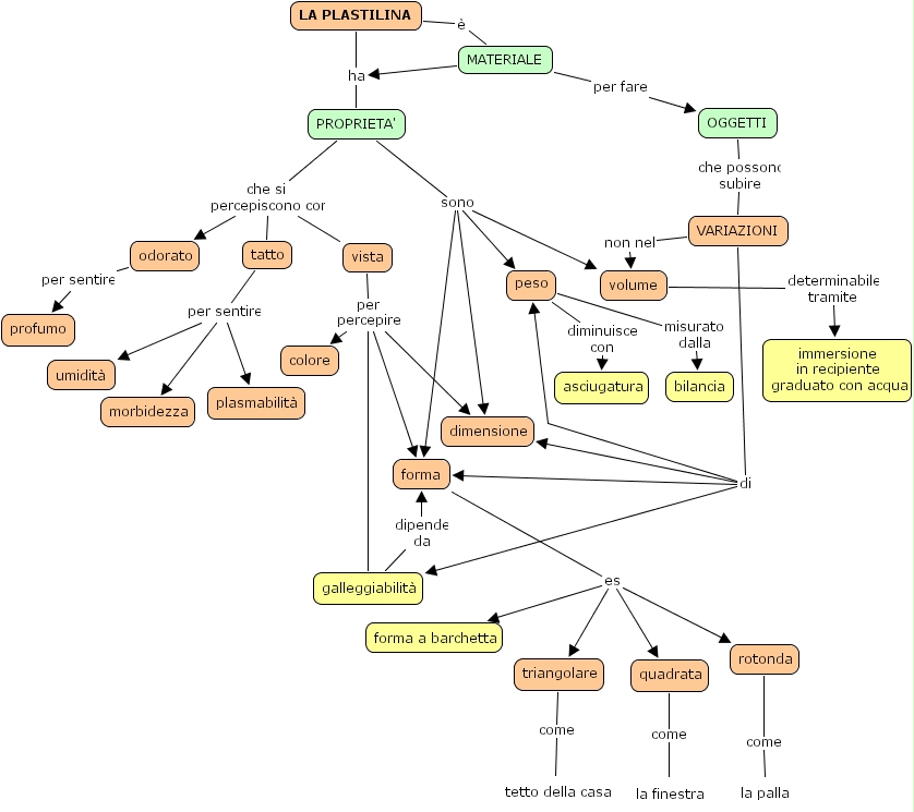 plastilina, umidit�, plasmabilit�, colore, materiale, tatto, peso, asciugatura, triangolare, dimensione, oggetti, rotonda, vista, galleggiabilit�, odorato, volume, forma, forma a barchetta, la finestra, bilancia, proprieta', immersione in recipiente graduato con acqua, morbidezza, profumo, variazioni, la palla, tetto della casa, la plastilina, quadrata