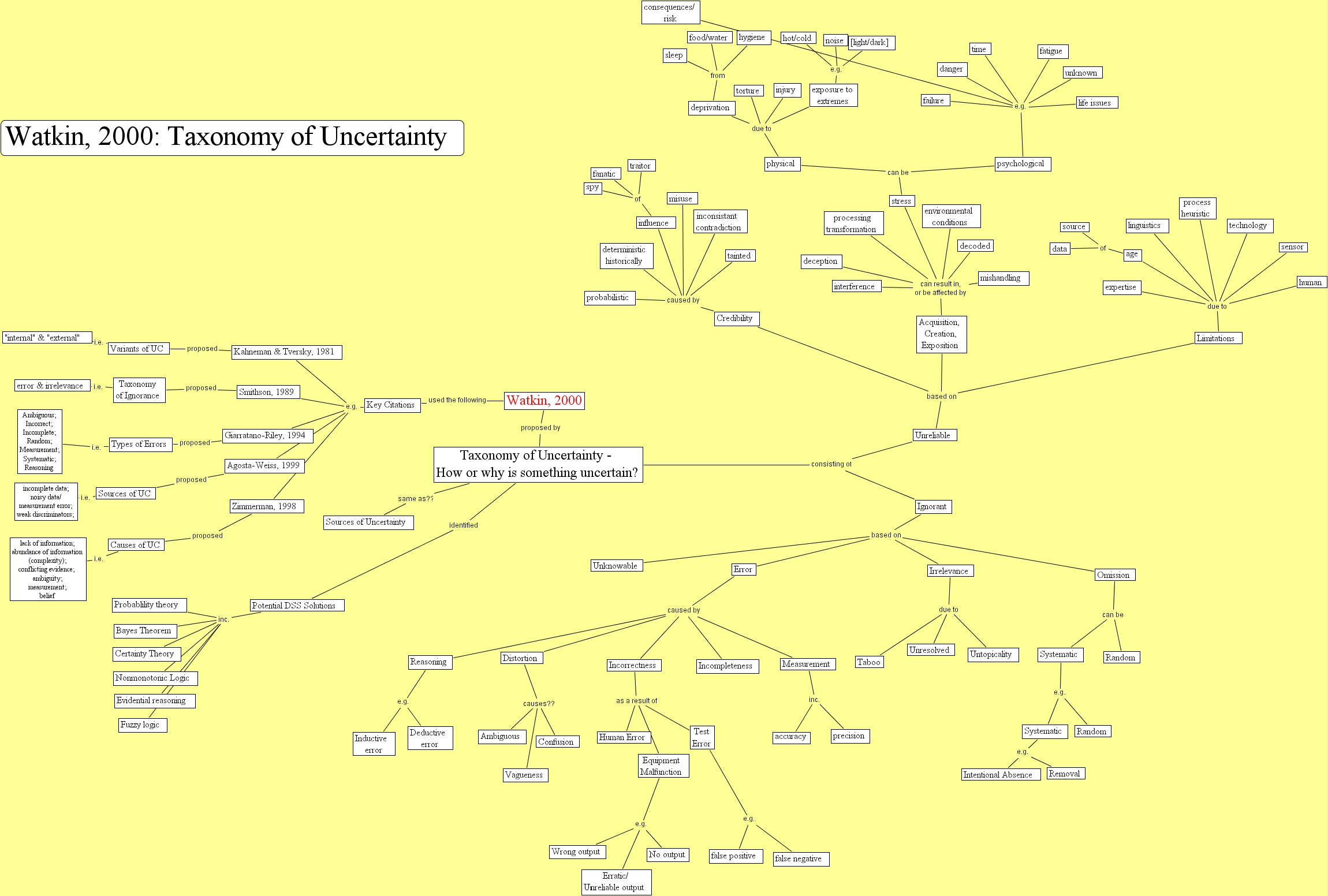 watkin's taxonomy 2000, deterministic historically, incorrectness, removal, age, giarratano-riley, 1994, error, vagueness, unresolved, measurement, deception, taxonomy of ignorance, certainty theory, causes of uc, wrong output, precision, probabilistic, limitations, types of errors, ambiguous, watkin, 2000, probablility theory, test error, random, equipment malfunction, ambiguous incorrect incomplete random measurement systematic reasoning, unknowable, influence, false positive, deductive error, sleep, taboo, human, exposure to extremes, human error, food water, systematic, variants of uc, process heuristic, hygiene, unknown, life issues, misuse, confusion, agosta-weiss, 1999, inconsistant contradiction, watkin, 2000 taxonomy of uncertainty, untopicality, stress, failure, tainted, potential dss solutions, time, false negative, noise, error & irrelevance, mishandling, acquisition, creation, exposition, taxonomy of uncertainty - how or why is something uncertain?, lack of information abundance of information (complexity) conflicting evidence ambiguity measurement belief, spy, [light dark], injury, fatigue, fuzzy logic, omission, interference, accuracy, bayes theorem, intentional absence, zimmerman, 1998, evidential reasoning, torture, consequences risk, source, sources of uncertainty, no output, nonmonotonic logic, fanatic, technology, decoded, unreliable, systematic, linguistics, environmental conditions, distortion, processing transformation, deprivation, sensor, traitor, incomplete data noisy data measurement error weak discriminators , internal & external , expertise, psychological, hot cold, ignorant, erratic unreliable output, irrelevance, incompleteness, credibility, kahneman & tversky, 1981, reasoning, data, sources of uc, smithson, 1989, random, physical, inductive error, danger, key citations
