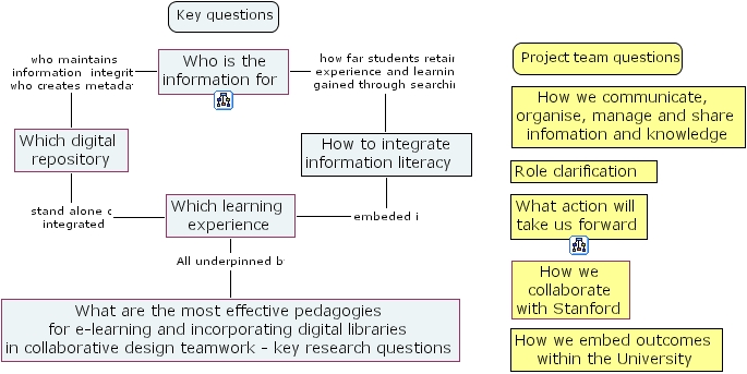 key questions, who is the information for , what are the most effective pedagogies for e-learning and incorporating digital libraries in collaborative design teamwork - key research questions, how to integrate information literacy , what action will take us forward , key questions, how we communicate, organise, manage and share infomation and knowledge, which digital repository, how we collaborate with stanford , how we embed outcomes within the university, which learning experience, project team questions, role clarification