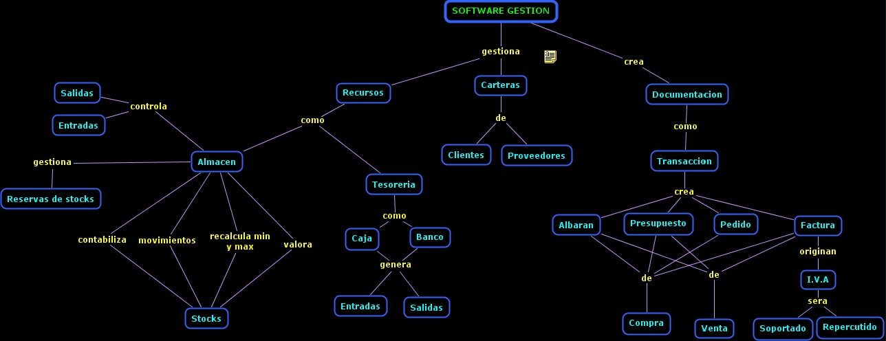 Almacen contabiliza Stocks, Almacen movimientos Stocks, Pedido de Compra, Tesoreria como Caja, Factura de Venta, Banco como Caja, Stocks valora Almacen, Presupuesto de Compra, Almacen controla Entradas, Almacen controla Salidas, Documentacion como Transaccion, Almacen gestiona Reservas de stocks, Albaran de Venta, Albaran de Compra, Caja genera Entradas, Caja genera Salidas, Factura de Compra, Presupuesto de Venta, SOFTWARE GESTION gestiona Carteras, I.V.A sera Soportado, I.V.A sera Repercutido, Tesoreria como Almacen, Stocks recalcula min y max Almacen, Recursos como Almacen, Banco genera Entradas, Banco genera Salidas, SOFTWARE GESTION crea Documentacion, Transaccion crea Pedido, Transaccion crea Presupuesto, Transaccion crea Albaran, Carteras de Clientes, Carteras de Proveedores, Factura crea Pedido, Factura crea Presupuesto, Factura crea Albaran, Recursos gestiona Carteras, Factura originan I.V.A