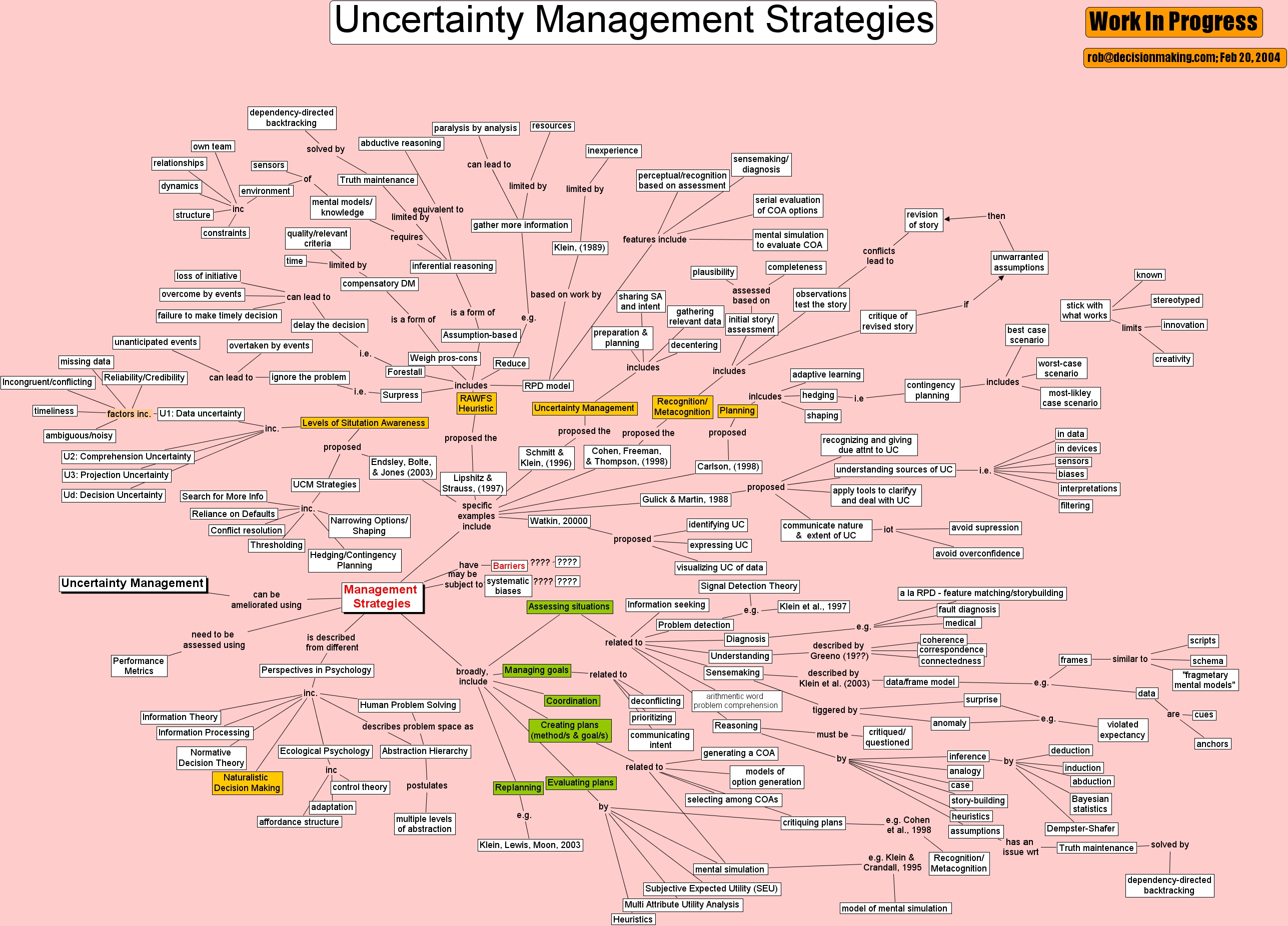uc management, klein, (1989), ecological psychology, delay the decision, apply tools to clarifyy and deal with uc, bayesian statistics, weigh pros-cons, cohen, freeman, & thompson, (1998), gather more information, truth maintenance, u1 data uncertainty, stereotyped, signal detection theory, levels of situtation awareness, anomaly, revision of story, correspondence, a la rpd - feature matching storybuilding, hedging contingency planning, uncertainty management, managing goals, assumptions, inferential reasoning, loss of initiative, understanding, inference, reliability credibility, abstraction hierarchy, narrowing options shaping, deconflicting, creating plans (method s & goal s), story-building, communicating intent, reliance on defaults, filtering, avoid overconfidence, mental simulation, most-likley case scenario, planning, best case scenario, overtaken by events, data frame model, sensors, endsley, bolte, & jones (2003), multiple levels of abstraction, lipshitz & strauss, (1997), deduction, resources, management strategies, biases, case, gathering relevant data, initial story assessment, failure to make timely decision, selecting among coas, sensemaking, rpd model, in data, dependency-directed backtracking, scripts, induction, diagnosis, communicate nature & extent of uc, understanding sources of uc, generating a coa, heuristics, mental simulation to evaluate coa, observations test the story, information seeking, ambiguous noisy, naturalistic decision making, prioritizing, information processing, watkin, 20000, assessing situations, paralysis by analysis, mental models knowledge, creativity, multi attribute utility analysis, recognition metacognition, affordance structure, models of option generation, rob@decisionmaking.com feb 20, 2004, arithmentic word problem comprehension, ????, ud decision uncertainty, forestall, uncertainty management strategies, dynamics, known, quality relevant criteria, assumption-based, model of mental simulation, normative decision theory, recognition metacognition, missing data, critique of revised story, unanticipated events, replanning, overcome by events, dependency-directed backtracking, thresholding, search for more info, plausibility, completeness, systematic biases, relationships, structure, decentering, heuristics, own team, cues, stick with what works, rawfs heuristic, ignore the problem, contingency planning, anchors, environment, hedging, problem detection, evaluating plans, violated expectancy, subjective expected utility (seu), performance metrics, sensemaking diagnosis, data, compensatory dm, carlson, (1998), reduce, constraints, time, barriers, klein et al., 1997, innovation, sharing sa and intent, ????, perspectives in psychology, timeliness, visualizing uc of data, worst-case scenario, interpretations, klein, lewis, moon, 2003, adaptation, avoid supression, expressing uc, abduction, identifying uc, human problem solving, analogy, coherence, reasoning, schema, perceptual recognition based on assessment, in devices, shaping, conflict resolution, ucm strategies, uncertainty management, abductive reasoning, serial evaluation of coa options, work in progress, u2 comprehension uncertainty, critiquing plans, dempster-shafer, surpress, medical , recognizing and giving due attnt to uc, sensors, coordination, gulick & martin, 1988, truth maintenance, fragmetary mental models , u3 projection uncertainty, inexperience, fault diagnosis, unwarranted assumptions, frames, information theory, adaptive learning, critiqued questioned, incongruent conflicting, surprise, connectedness, preparation & planning, schmitt & klein, (1996), control theory
