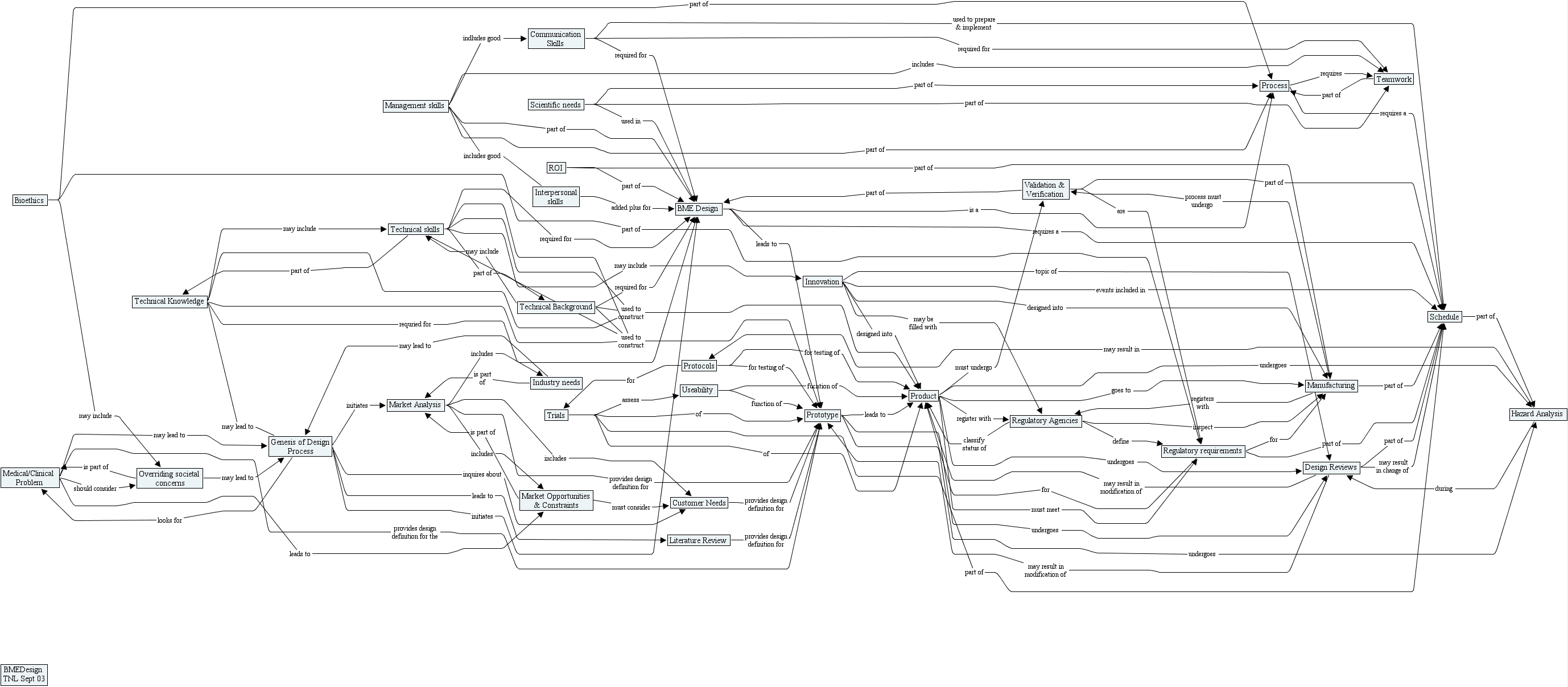 tnl concept map (hierarchical format), overriding societal concerns, regulatory agencies, customer needs, scientific needs, communication skills, literature review, regulatory requirements, industry needs, medical clinical problem, market analysis, market opportunities & constraints, useability, hazard analysis, bioethics, validation & verification, roi, teamwork, trials, product, prototype, protocols, genesis of design process, management skills, schedule, technical knowledge, process, innovation, manufacturing, interpersonal skills, bmedesign tnl sept 03, design reviews, bme design, technical background, technical skills