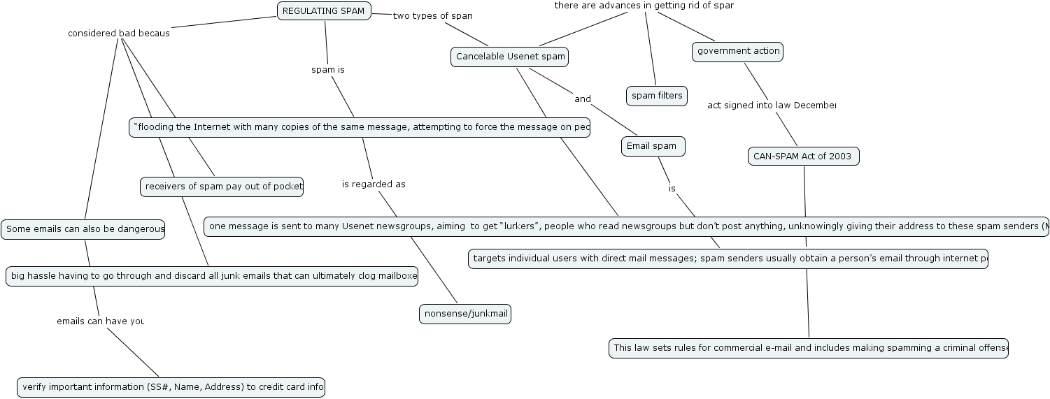 news concept map, verify important information (ss , name, address) to credit card info, targets individual users with direct mail messages spam senders usually obtain a person�s email through internet posts, this law sets rules for commercial e-mail and includes making spamming a criminal offense, cancelable usenet spam , spam filters, one message is sent to many usenet newsgroups, aiming to get �lurkers�, people who read newsgroups but don�t post anything, unknowingly giving their address to these spam senders (mueller) , nonsense junkmail, receivers of spam pay out of pocket, email spam , can-spam act of 2003 , regulating spam, big hassle having to go through and discard all junk emails that can ultimately clog mailboxes., �flooding the internet with many copies of the same message, attempting to force the message on people, government action, some emails can also be dangerous