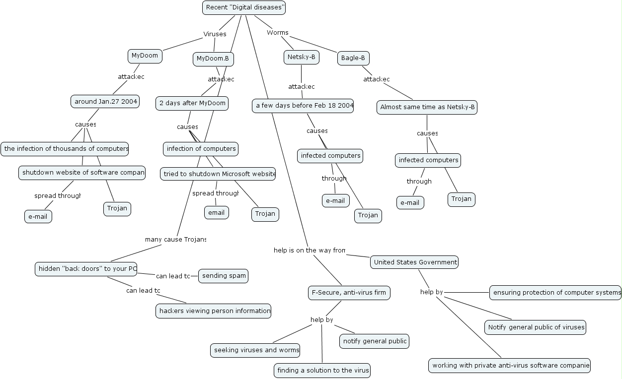digital diseases, trojan, almost same time as netsky-b, e-mail, hackers viewing person information, tried to shutdown microsoft website, trojan, f-secure, anti-virus firm, the infection of thousands of computers, hidden back doors to your pc, united states government, ensuring protection of computer systems, infected computers, finding a solution to the virus, mydoom, infected computers, email, seeking viruses and worms, 2 days after mydoom, around jan.27 2004, mydoom.b, sending spam, bagle-b, shutdown website of software company, trojan, infection of computers, working with private anti-virus software companies, trojan, e-mail, netsky-b, recent digital diseases , a few days before feb 18 2004, notify general public of viruses, notify general public, e-mail