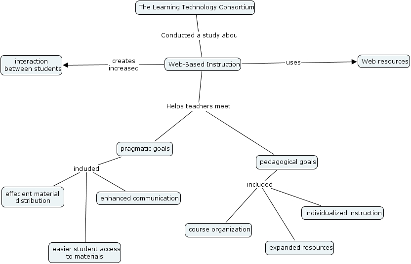 cmap, enhanced communication, interaction between students, individualized instruction, web resources, the learning technology consortium, web-based instruction, easier student access to materials, course organization, expanded resources, effecient material distribution, pedagogical goals, pragmatic goals