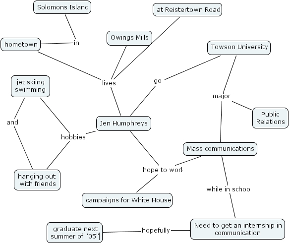 jencamp, jen humphreys, campaigns for white house, at reistertown road, towson university, need to get an internship in communication, solomons island, mass communications, public relations, graduate next summer of 05 , jet skiing swimming, hanging out with friends, owings mills, hometown