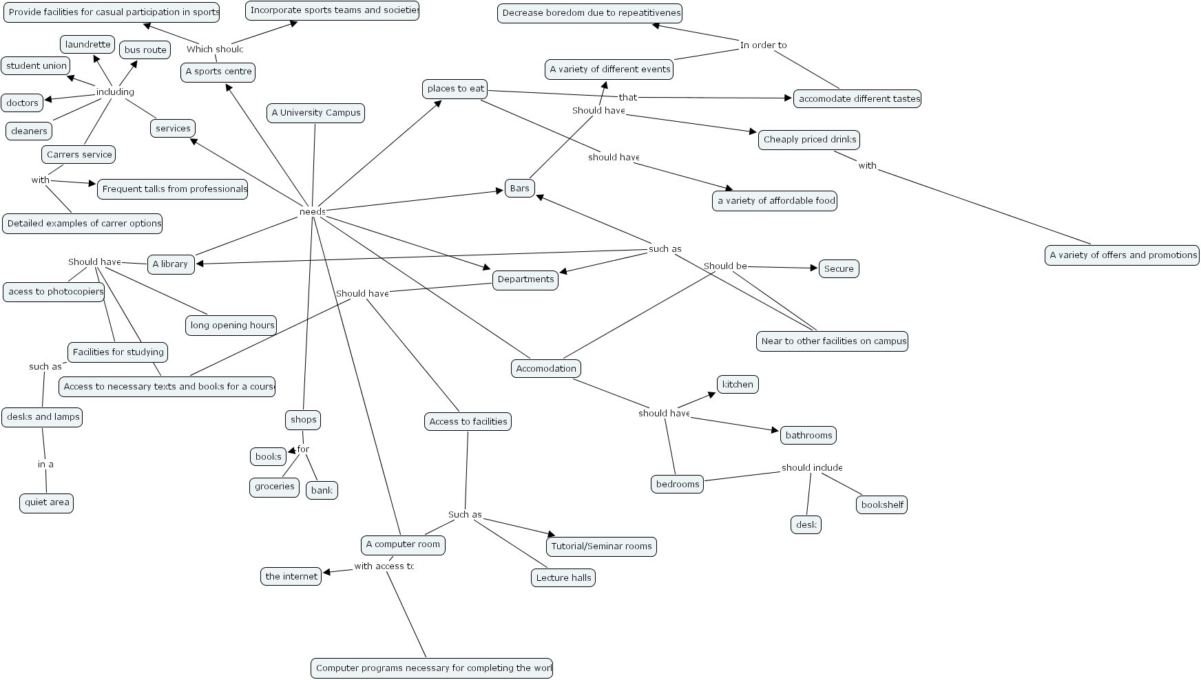 no 29&30, bank, a library, decrease boredom due to repeatitiveness, groceries, frequent talks from professionals, kitchen, access to necessary texts and books for a course, long opening hours, shops, provide facilities for casual participation in sports, cleaners, accomodation, incorporate sports teams and societies, doctors, desk, desks and lamps, a variety of affordable food, places to eat, a computer room, bars, quiet area, a variety of different events, the internet, services, bus route, secure, access to facilities, bookshelf, a variety of offers and promotions, books, bathrooms, carrers service, a sports centre, computer programs necessary for completing the work, near to other facilities on campus, tutorial seminar rooms, departments, student union, detailed examples of carrer options, bedrooms, accomodate different tastes, acess to photocopiers, facilities for studying, lecture halls, a university campus, laundrette, cheaply priced drinks