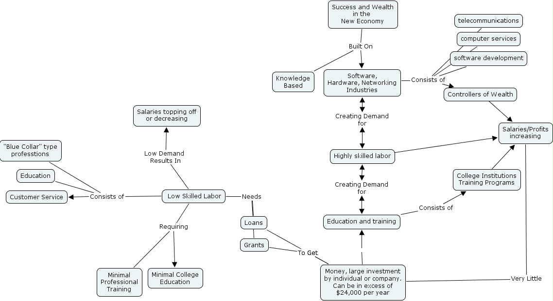 new economy, customer service, telecommunications, money, large investment by individual or company. can be in excess of $24,000 per year, software, hardware, networking industries, grants, salaries profits increasing, college institutions training programs, computer services, highly skilled labor, software development, minimal professional training, knowledge based, minimal college education, education, loans, salaries topping off or decreasing, low skilled labor, blue collar type professtions, success and wealth in the new economy, controllers of wealth, education and training